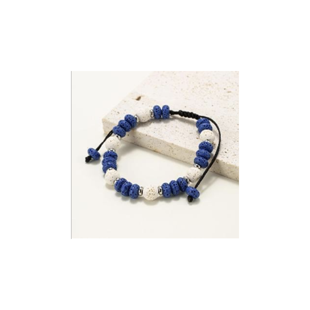 5 10 Bracelets en perles rondes et plates en pierre de lave naturelle teintées bleu et blanc